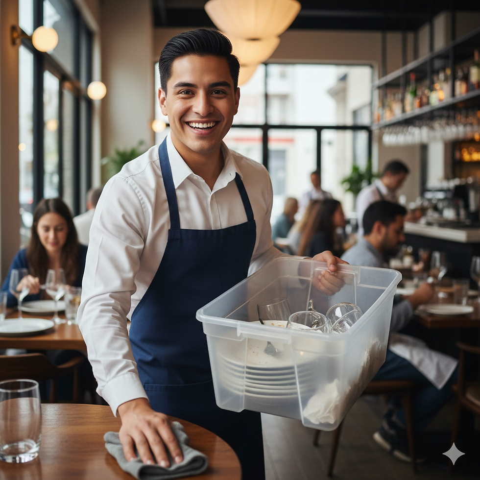 El Busser es responsable de mantener la limpieza general del restaurante y apoyar al equipo para asegurar una excelente experiencia para los clientes.